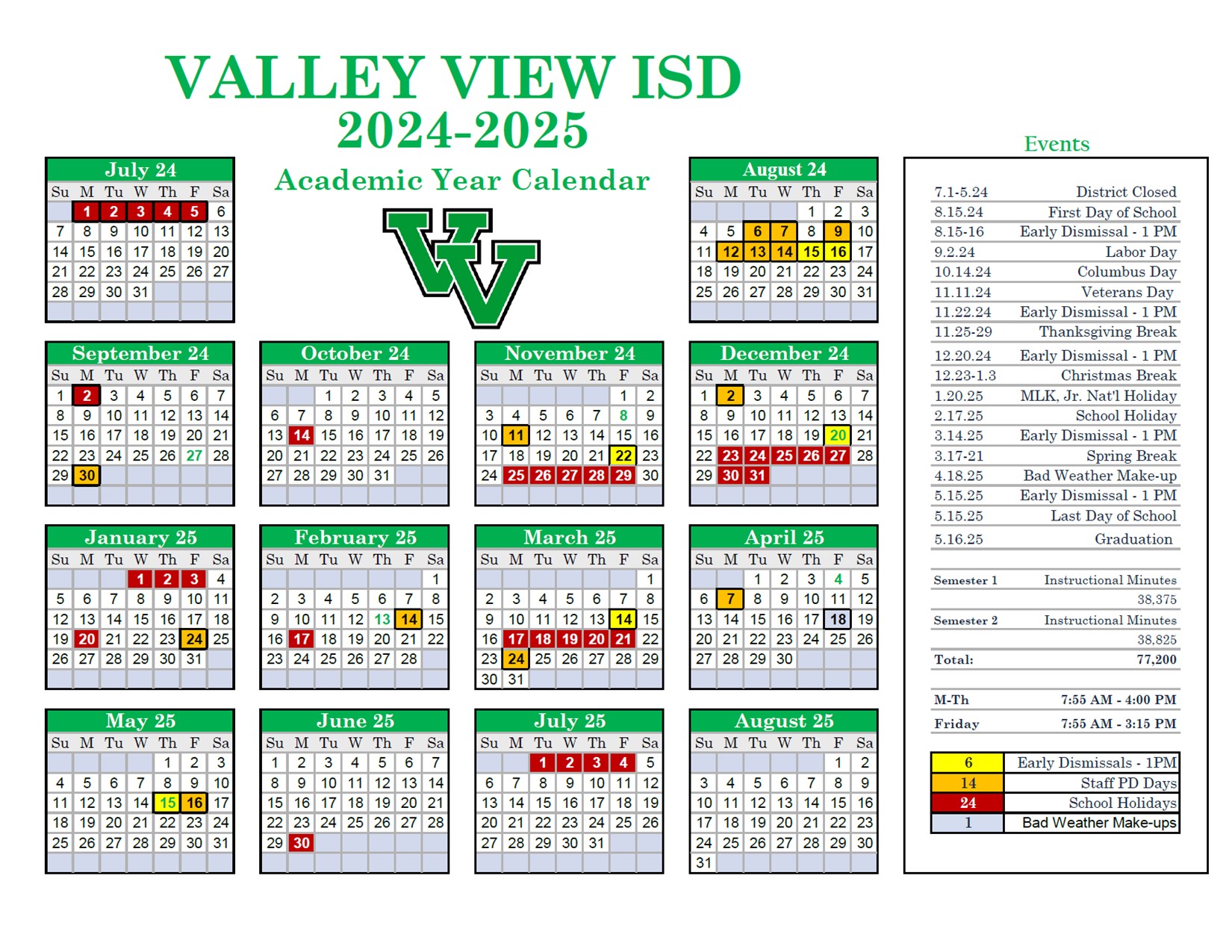 Our Board Adopted Academic Calendar has been posted on the VVISD Website. The adopted calendar is shown below for your convenience.